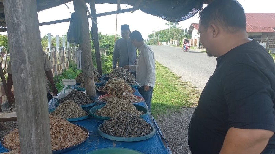 Tim Pengabdian kepada Masyarakat (PKM) Sekolah Tinggi Agama Islam Negeri (STAIN) Teungku Dirundeng Meulaboh melakukan pemantauan lanjutan terhadap perkembangan digitalisasi pemasaran usaha ebi dan ikan asin milik warga Desa Kuala Tuha, Kabupaten Nagan Raya, Sabtu 22 November 2025.